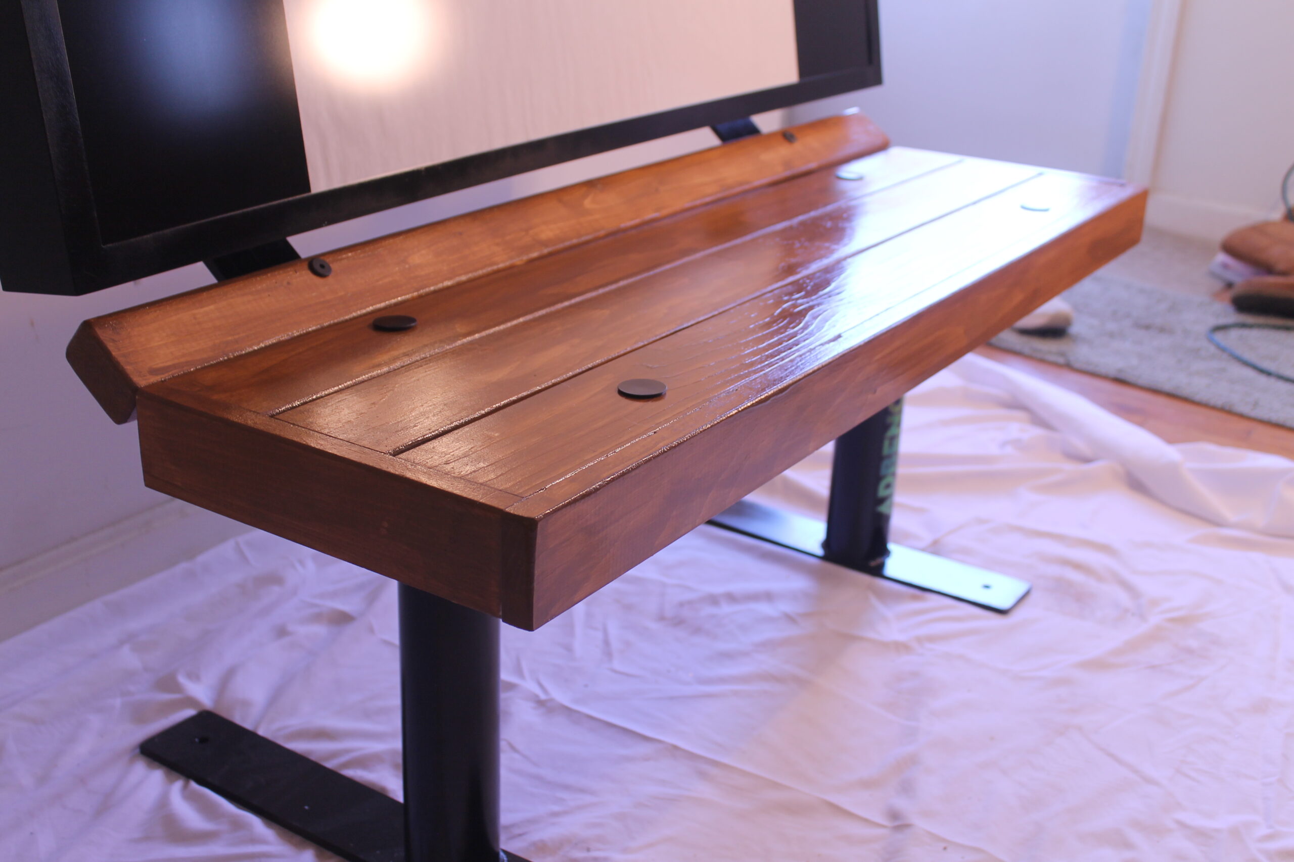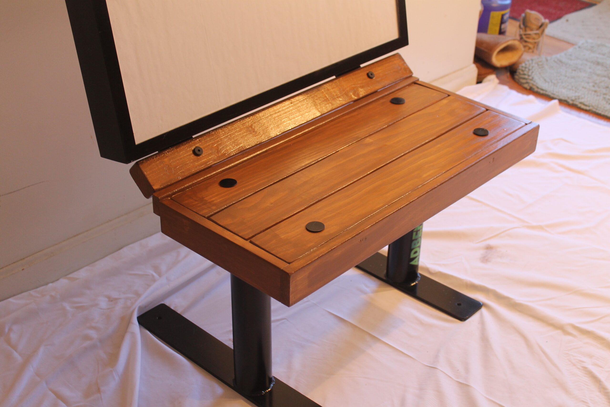 The overall standard 32L video bench size is 44″ long, 25″ deep, and 39″ high; color black; approximate weight 135 lbs. Bench legs and bench support are fabricated with heavy-grade steel, and the display support back is fabricated of aircraft-grade aluminum. Very durable, easy to wipe down for cleaning, built for “Indoor Use Only.”